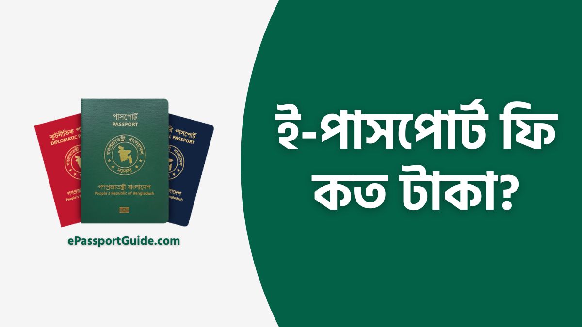 - ৫ বছর মেয়াদি ৪৮ পেজের ই পাসপোর্টের রেগুলার ফিস ৪০২৫ টাকা, এক্সপ্রেস ফিস ৬৩২৫ টাকা এবং সুপার এক্সপ্রেস ফিস ৮৬২৫ টাকা।